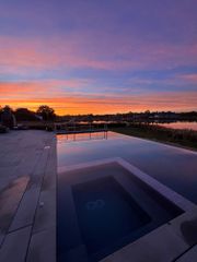 The 24ft sliders straight ahead draw you out to 3000sq ft patio with spacious covered porch, indoor/ outdoor bar, bathroom & infinity edge pool overlooking the 125ft frontage of the Shrewsbury River.